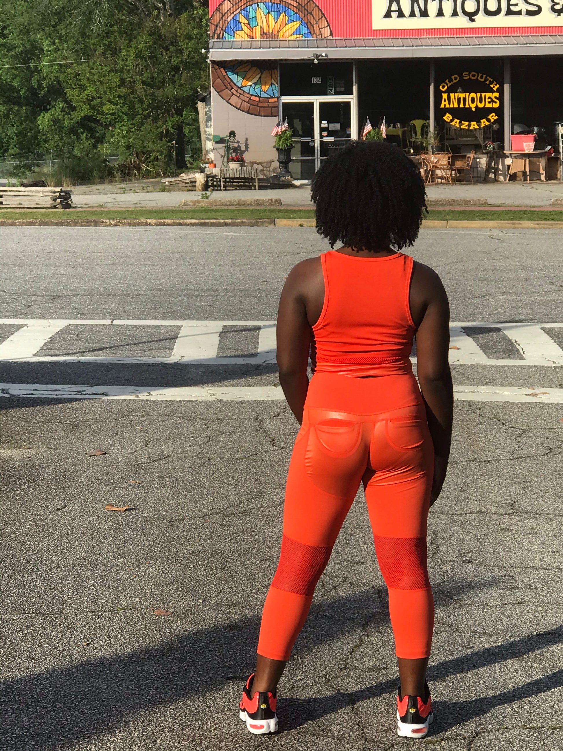 TANGERINE SHEER MESH CROP TOP AND CAPRI SET - 92% Polyester, 8% Spandex